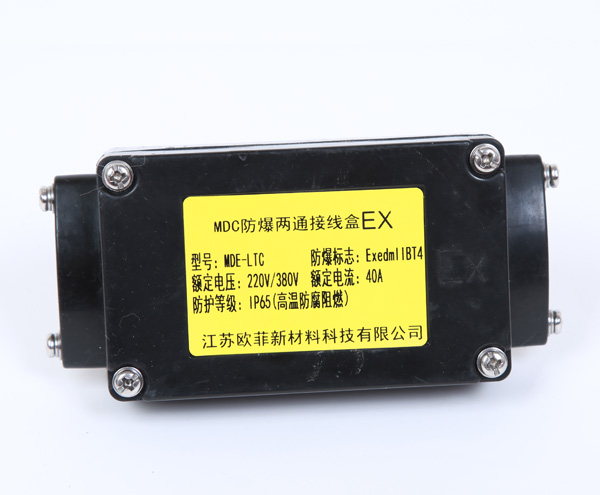 增安型中間防爆接線盒用于防爆區域與電熱帶之間的連接,以增加電熱帶的長度或用在同一管線上配不同功率的電熱帶及三叉管等較復雜的場合。它有MDE型直行接線盒與MDT型T型接線盒兩種型式,它們都按“增安型”防爆電器設計制造。防爆標志“ellT4”,與電熱帶配套后適用于工廠一區、二區爆炸性氣體混合物T4組場所。其外殼為SMC。